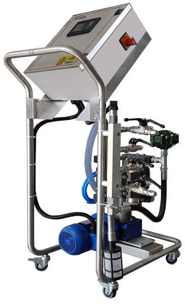 Automatic airless pump for the application of high-abrasion products such as glazes, engobes and crystallines. The machine is driven by an electric motor coupled to a diaphragm-type pump, mechanically operated by a 3-piston system at 120° to each other, a solution that combined with a pulsation damper and 06 glaze outlets, allows optimization of product atomization, achieving full-time operation without personnel intervention. The control system will be able to reach and maintain constant the glaze pressure value set by the operator. The system will be able to reach and maintain constant the glaze pressure value set by the operator, thanks to automatic control software and inverter. The system will manage a photocell for controlling the flow of incoming pieces and in their absence will automatically reduce the operating pressure to a “Standby” value, then promptly restore the Set-point value upon arrival of the next piece. Glaze delivery at constant pressure thanks to the pressure sensor with feedback. Electrical panel with PLC and 4.7″ color touch-screen.