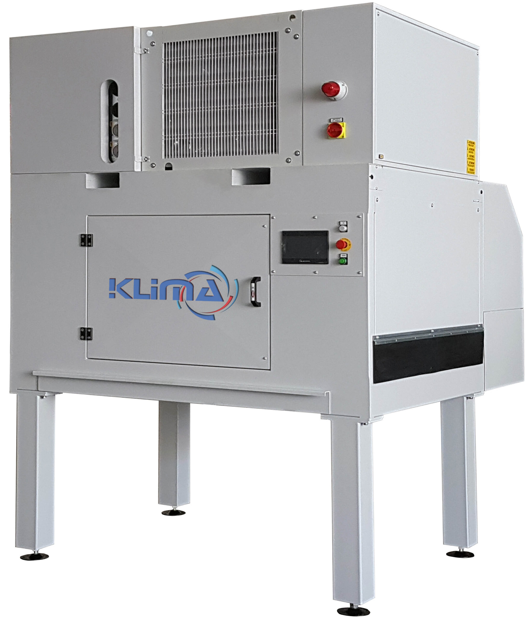 Tile cooler, to be positioned on the glazing line to reduce the temperature of pieces before digital decoration with inkjet machines. Klima facilitates uniform and defect-free decoration, extends the life of print heads and eliminates problems arising from vapor release from tiles in transit. Klima is a single-compressor “all-in-one” device and does not require external cooling or condensation units. It does not require cleaning cycles during operation as the machine is not equipped with filters and uses automatic cleaning devices for the cooling radiators. It installs in just a few minutes as it uses the existing transport, avoiding additional supplementary mechanical work such as line interruption or pipe installation.