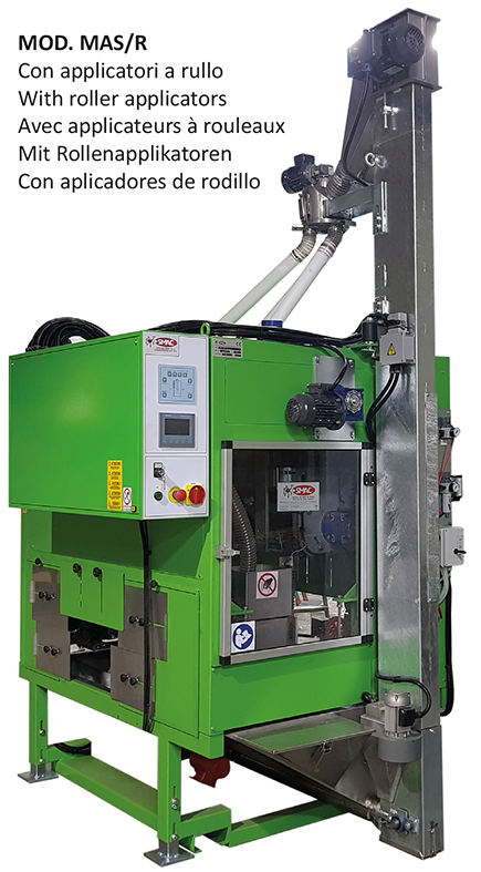 Sandblasting machine for bricks with roller application. Automatic recycling. Suitable for sands, frits, grits, granulates and sintered glazes.