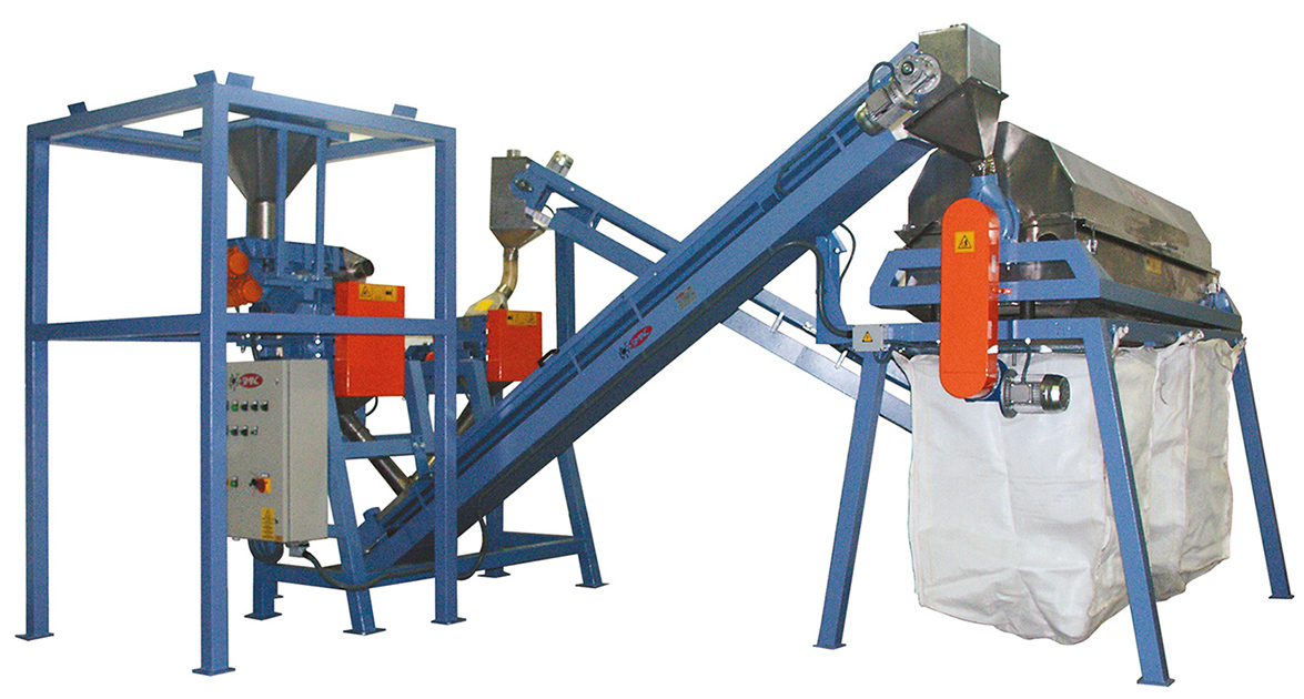 Double closed-cycle plant, complete with big-bag carrier frame, vibrating chute, 2 grinding units, conveyor belts and rotary screen with 2 selections.